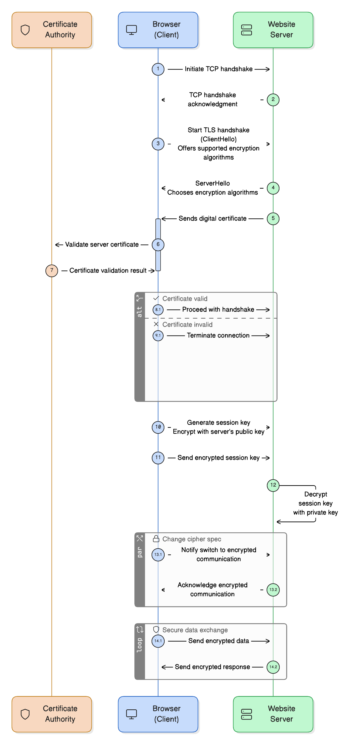 TLS handshake begins: your browser checks the website’s digital certificate.