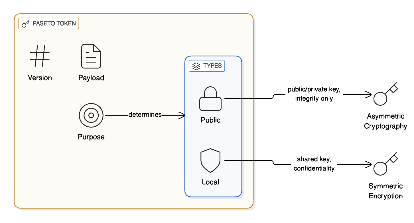 Public PASETO – Uses asymmetric cryptography (public/private key pair). It guarantees the integrity of data but not confidentiality.