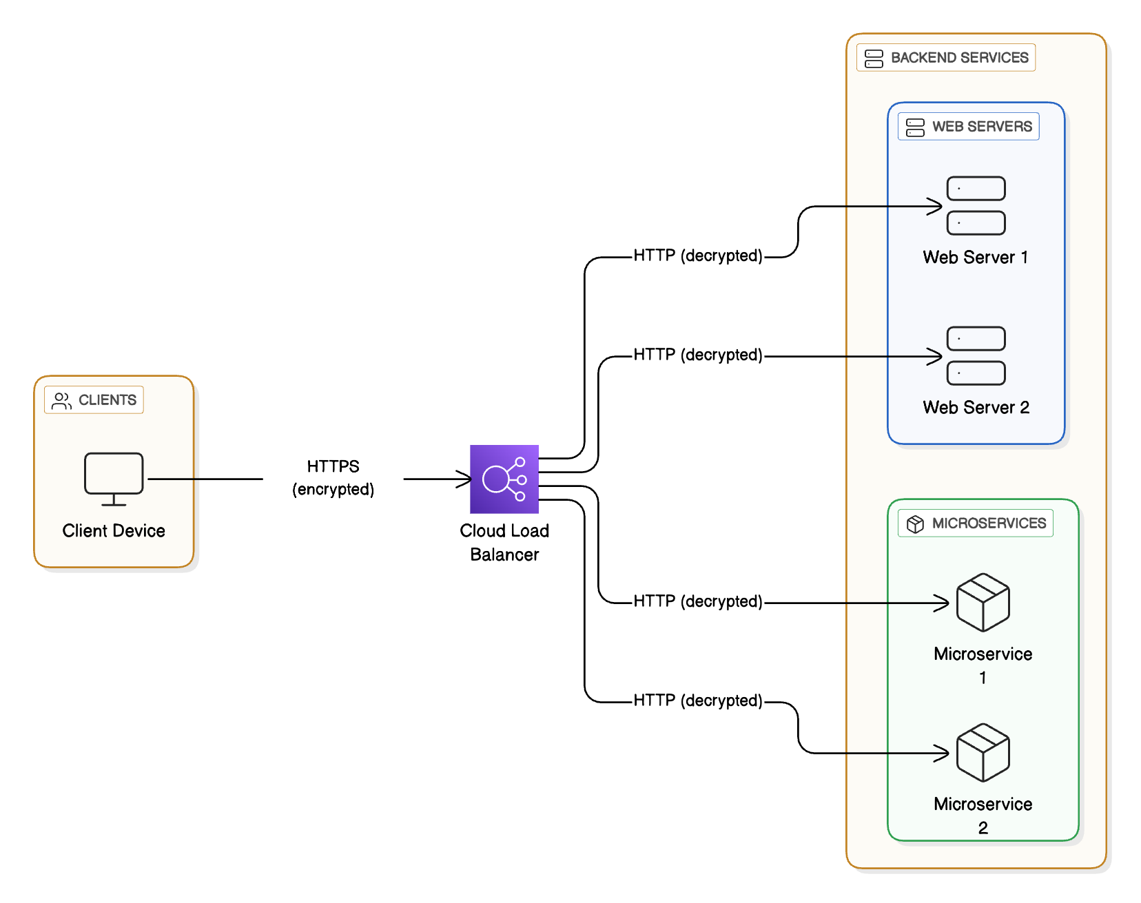 This means the load balancer manages encryption, and backend servers only handle unencrypted traffic. The result is better performance and reduced server load, especially in applications with high traffic volumes.